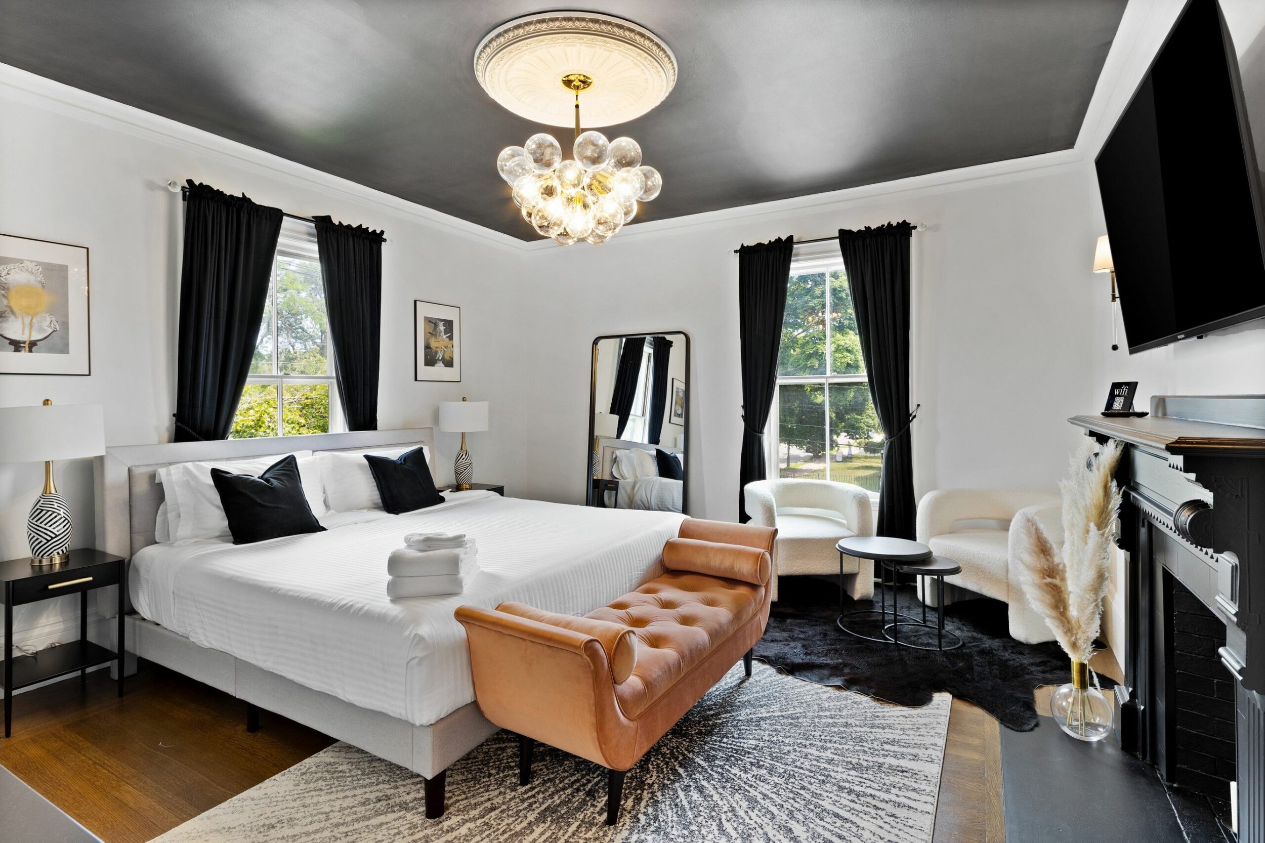 Classic Queen Rooms, featuring a plush memory foam bed dressed in Frette linens, an original 1879 fireplace, a striking glass chandelier and a Keurig coffee maker. Private bathroom with a sleek tiled shower, C.O. Bigelow toiletries, and Frette towels.